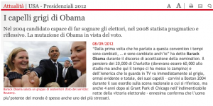 “Dalla prima volta che ho parlato a questa convention i tempi sono cambiati, … e sono cambiato anch’io” ha detto Barack Obama durante il discorso di accettazione della nomination. Il pensiero dei 20,000 di Charlotte (dovevano essere 60,000 allo stadio ma anche qui il tempo ci ha messo lo zampino) e dell’America che lo guarda in TV va immediatamente al grigio, ormai evidente e totale, dei suoi capelli – corvini a Boston 2004 durante il suo esordio sulla scena nazionale a cui si riferisce, ma anche 4 anni dopo al Grant Park di Chicago nell’indimenticabile notte della vittoria elettorale – ennesima conferma che l’uomo piu’potente del mondo è spesso anche uno dei più stressati.